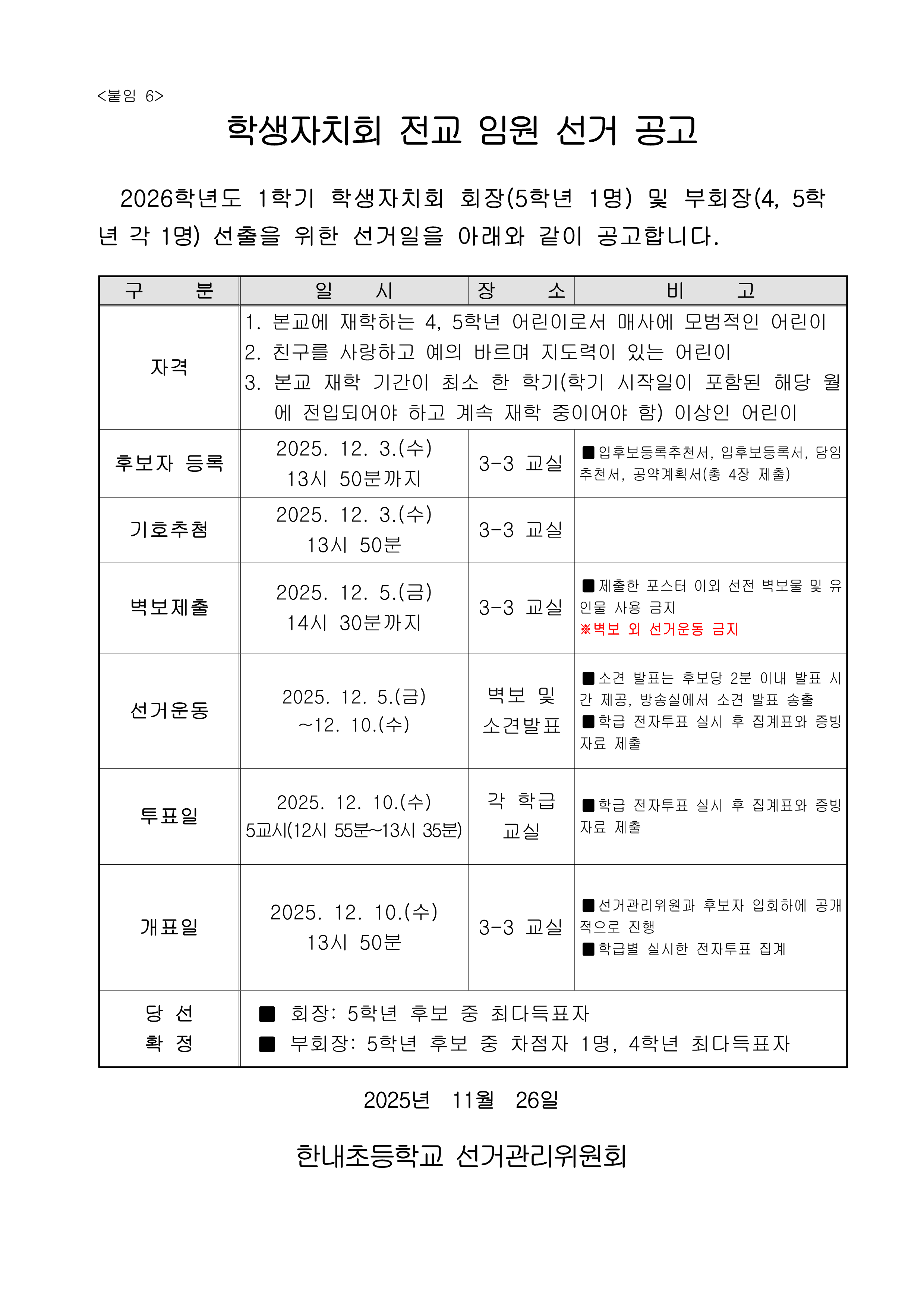 2026학년도 학생자치회 1학기 전교임원 선거 공고